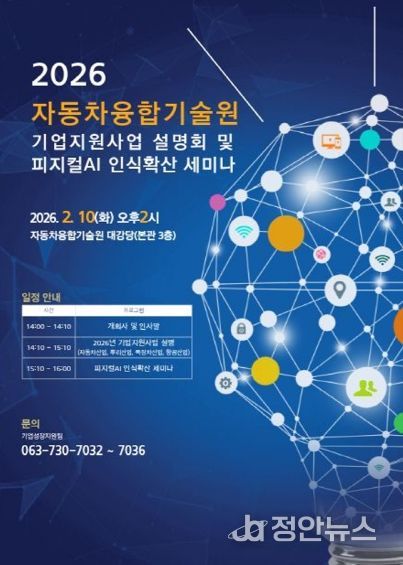 정안뉴스 안정주 기자 | 전북특별자치도는 도내 자동차·뿌리·특장·항공산업 등 주력산업의 경쟁력 강화를 위해 오는 10일 자동차융합기술원에서 ‘2026년 기업지원사업 설명회 및 피지컬AI 산업 인식확산 세미나’를 개최한다고 5일 밝혔다.