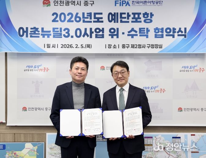김정헌 인천 중구청장과 홍종욱 한국어촌어항공단 이사장은 5일 오전 중구 제2청 구청장실에서 ‘예단포항 어촌뉴딜3.0 사업 위·수탁 협약’을 체결했다.