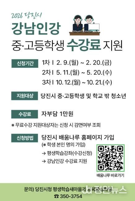 정안뉴스 황도연 기자 | 당진시는 사교육비로 인한 부모들의 경제적 부담 덜기 위해 당진시 중고등학생과 학교 밖 청소년을 대상으로 ‘강남인강’ 수강료를 지원한다고 6일 밝혔다.