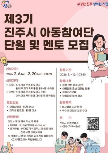 아동참여단은 아동의 권리 증진과 정책 참여를 목표로 하는 진주시의 대표적인 아동 참여 기구로, 2026년 3월부터 12월까지 ▲아동정책 제안 활동 ▲아동권리 교육 및 아동권리 캠페인 활동 참여 ▲아동관련 행사 참여 등 다양한 활동을 하게 된다.