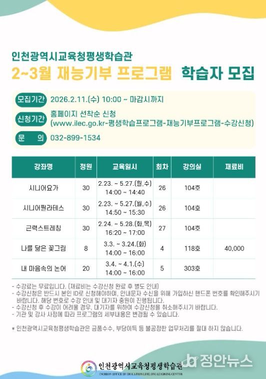 정안뉴스 안정주 기자 | 인천광역시교육청평생학습관은 오는 23일부터 ‘재능기부 프로그램’을 운영한다.