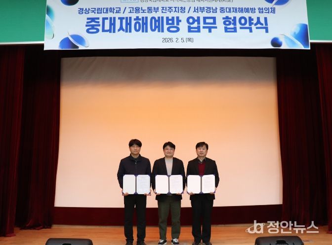 정안뉴스 김재홍 기자 | 경상국립대학교 라이즈(RISE) 사업단은 2월 5일 사천시 근로자종합복지관에서 서부경남 중대재해 예방 협의체 및 고용노동부 진주지청과 업무협약을 체결했다.