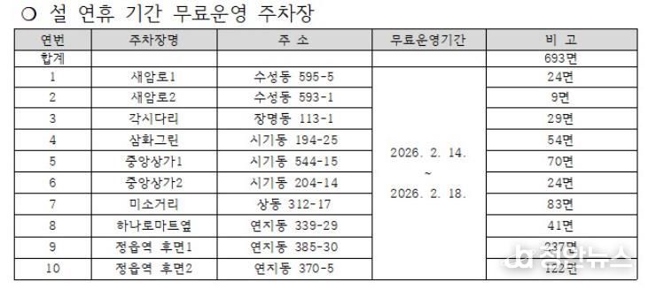 이번 조치는 명절을 맞아 고향을 찾는 귀성객과 시민들에게 주차 편의를 제공하고 시민들이 부담 없이 도심 상권과 전통시장을 이용할 수 있도록 유도해 지역 경제에 활력을 불어넣기 위해 마련됐다.