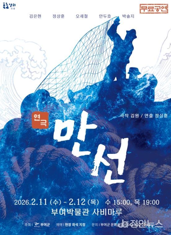 정안뉴스 황도연 기자 | 부여군은 오는 2월 11일 오후 3시와 12일(목) 오후 7시, 부여박물관 사비마루에서 연극 ‘만선’을 개최한다.