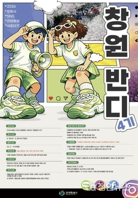 정안뉴스 김재홍 기자 | 창원특례시는 창원 관광의 매력을 알릴 참신한 온라인 콘텐츠를 발굴하고 시민과 소통하는 관광홍보를 강화하기 위해 '2026 창원시 SNS 관광홍보 서포터즈 ‘창원반디 4기’'를 모집한다고 밝혔다.