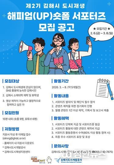 정안뉴스 김재홍 기자 | 김해시도시개발공사(이하 공사)는 오는 3월 8일까지 ‘제2기 김해시 도시재생 해피업(UP)숏폼 서포터즈’를 모집한다.