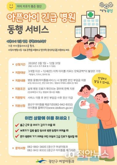 정안뉴스 안정주 기자 | 광주 광산구가 3월 1일부터 부모가 곁에 없거나 돌봐주기 어려운 상황에서 갑작스럽게 진료가 필요한 아동을 위한 ‘아픈 아이 긴급 병원 동행’ 서비스를 시행한다.