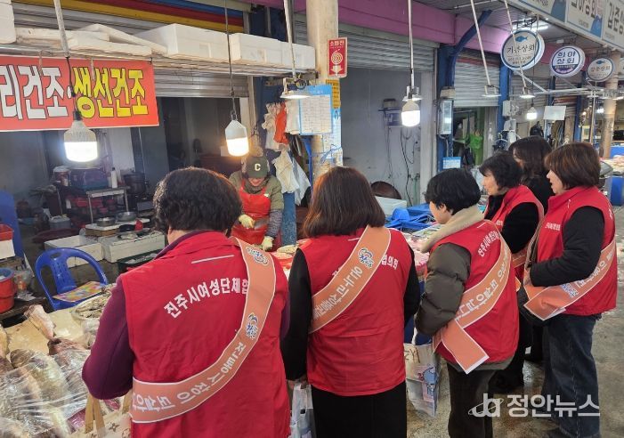 정안뉴스 김재홍 기자 | 진주시여성단체협의회(회장 이보화)는 9일 설 명절을 맞아 지역 경제 활성화를 위한 전통시장 장보기 행사를 실시했다.
