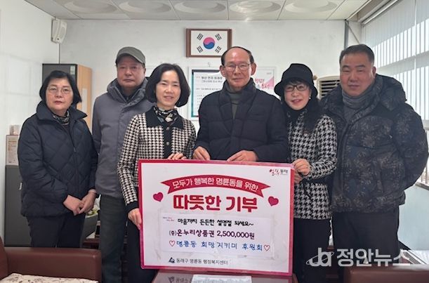 정안뉴스 황정혜 기자 | 부산 동래구 명륜동 행정복지센터는 지난 9일 희망지키미 후원회(회장 조치선)로부터 설 명절을 맞아 250만 원 상당의 온누리상품권을 전달받았다고 밝혔다.