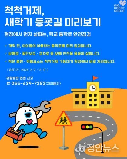 정안뉴스 김재홍 기자 | 거제시는 새학기를 앞두고 학생들의 안전한 통학환경 조성을 위해 '척척거제, 새학기 등굣길 미리보기' 기획순찰을 오는 2월 9일부터 3월 13일까지 추진한다.