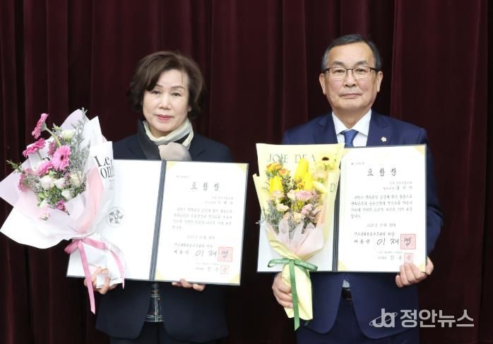 정안뉴스 안정주 기자 | 전주시의회 최주만 부의장과 박혜숙 문화경제위원장이 10일 전북특별자치도청에서 열린 민주평화통일자문회의 의장표창 전수식에서 의장상을 수상했다.