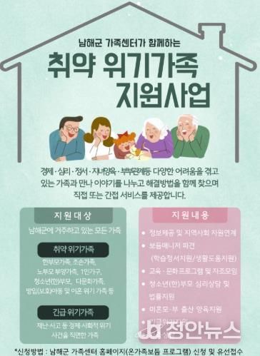 정안뉴스 김재홍 기자 | 남해군 가족센터는 위기 상황에 처한 가정과 다양한 형태의 가족을 지원하기 위해 2026년 ‘취약·위기가족지원사업(온가족보듬사업)’을 추진한다고 밝혔다.