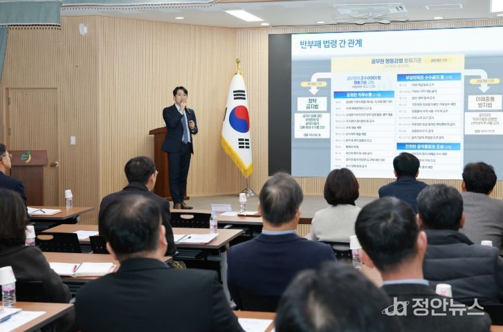 정안뉴스 황도연 기자 | 금산군은 설 명절을 앞두고 청렴의식 제고와 공직기강 확립을 위해 지난 10일 군청 다목적회의실에서 간부 공무원 청렴교육을 시행했다.