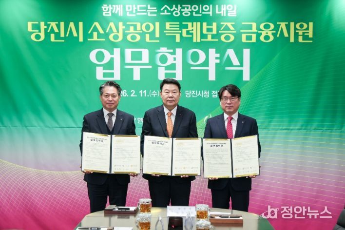 당진시는 11일 당진시청 접견실에서 오성환 당진시장과 오주현 NH농협은행 충남본부장, 조소행 충남신용보증재단 이사장이 참석한 가운데 소상공인 특례보증 금융지원 업무협약을 체결하고, 지역 소상공인을 위한 금융지원 규모를 추가로 확충했다고 밝혔다.