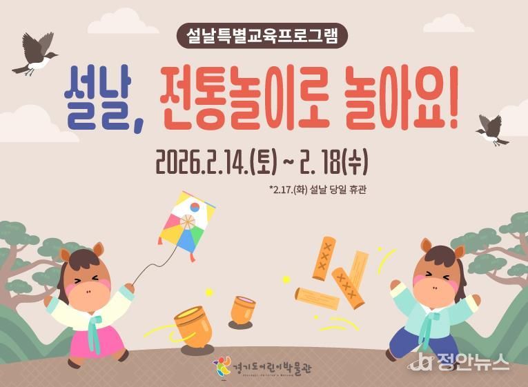 정안뉴스 안정주 기자 | 경기문화재단 경기도어린이박물관은 설날을 맞이하여 2026년 2월 14일부터 2월 18일까지 설날 특별프로그램 '설날, 전통놀이로 놀아요!'를 운영한다. 설 연휴 동안 박물관을 방문하는 어린이와 동반 가족을 위해 가족 간의 유대감을 높일 수 있는 전통문화 체험프로그램 3종을 준비했다.