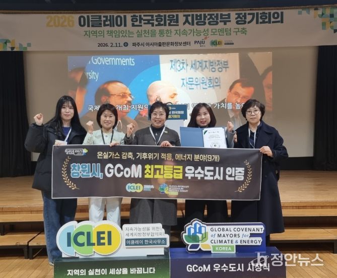 정안뉴스 김재홍 기자 | 창원특례시는 글로벌 기후·에너지 시장협약(GCoM) 최고등급 도시로 선정돼, 2월 11일 세계지방정부협의회(이클레이)가 주최하는 '지방정부 정기회의‘에서 2025년도 이행평가 최고등급을 수상했다.