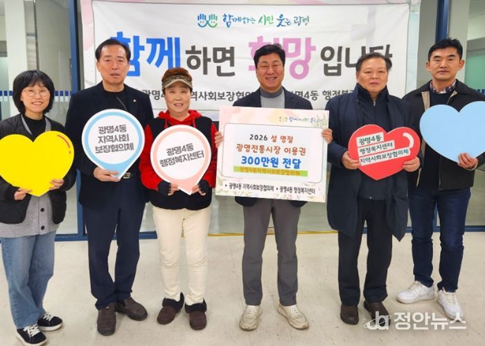 정안뉴스 안정주 기자 | 광명시 광명4동 지역사회보장협의체는 11일 설 명절을 맞아 관내 저소득 취약계층 50가구에 총 300만 원 상당의 광명전통시장 이용권을 전달했다.