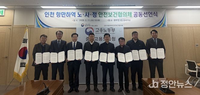 정안뉴스 안정주 기자 | 중부지방고용노동청은 2월 11일 인천 항만하역 현장의 산업재해 예방과 안전문화 정착을 위해 노동자·사업주·정부가 함께하는 ‘인천 항만하역 노·사·정 안전보건협의체 공동선언식’을 개최했다.