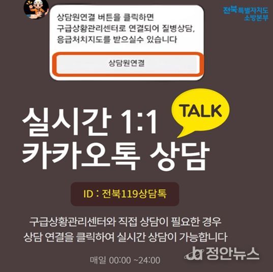 또한 전화 통화가 어려운 상황에서도 의료 상담을 받을 수 있도록 카카오톡 기반 비대면 상담 서비스인 ‘전북119상담톡’을 운영해 병·의원 운영 여부 확인과 의료 상담, 응급처치 안내를 보다 편리하게 제공받을 수 있다.