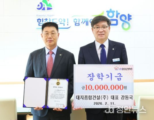 정안뉴스 김재홍 기자 | (재)함양군장학회는 2월 11일 대지종합건설(주) 강동국 대표가 함양군 지역 학생들을 위해 장학금 1,000만 원을 기탁했다고 밝혔다.