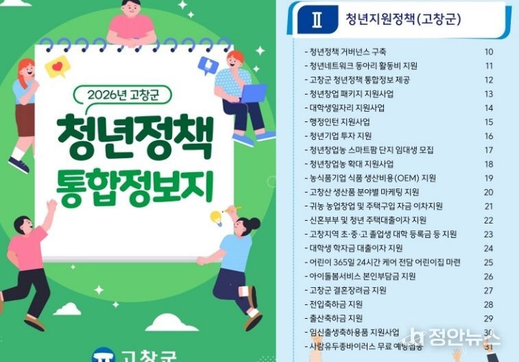 정안뉴스 안정주 기자 | 전북 고창군이 청년정책을 한눈에 확인할 수 있는 ‘2026년 고창군 청년정책 통합정보지’를 발간했다.