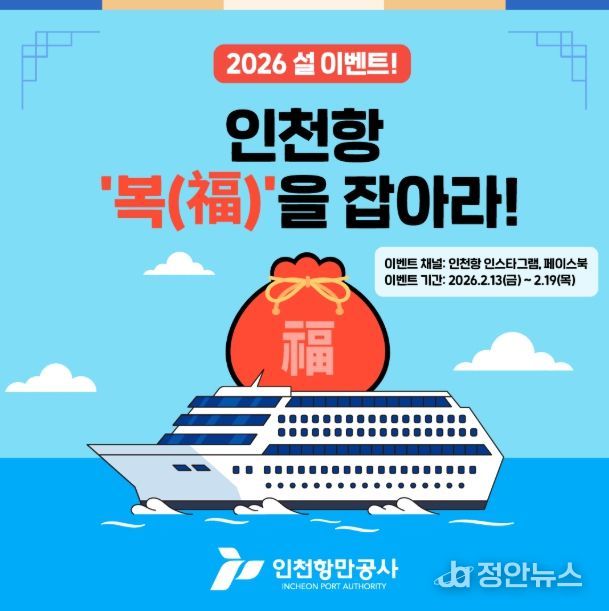 정안뉴스 안정주 기자 | 인천항만공사는 2026년 설 명절을 맞아 공식 SNS 채널(인스타그램, 페이스북)을 활용한 참여형 이벤트 “인천항 복(福)을 잡아라”를 진행한다고 12일 밝혔다.