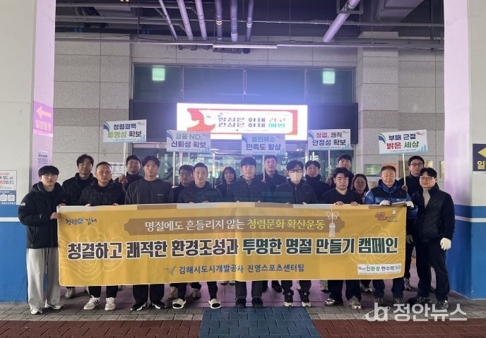 정안뉴스 김재홍 기자 | 김해시도시개발공사 진영스포츠센터는 설 명절을 앞두고 센터 인근 주천강 일대에서 환경정화 활동과 청렴문화 확산 캠페인을 전개했다고 11일 밝혔다.