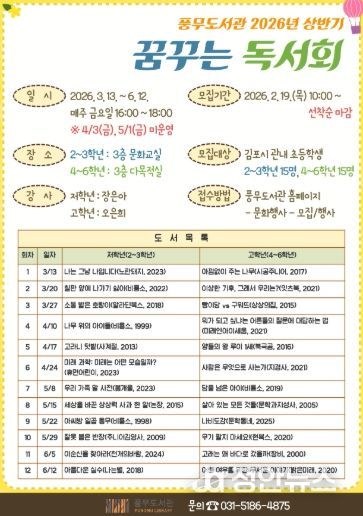 정안뉴스 안정주 기자 | 김포시 풍무도서관은 오는 3월 13일부터 6월 12일까지 매주 금요일 총 12회에 걸쳐 2026년 상반기 ‘꿈꾸는 독서회’를 운영한다.