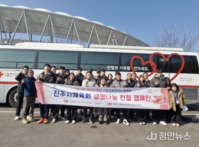 정안뉴스 김재홍 기자 | 진주시체육회는 12일 MBC컨벤션 앞에서 ‘2026 생명나눔 헌혈 캠페인’을 펼쳤다.