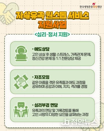 해당 사업은 유족 발생 시 경찰과 즉시 연계해 초기 대응에 나서고, 관할 기초정신건강복지센터를 통해 정서적인 지원을 제공하여 유족의 심리적 충격 완화를 돕는다.