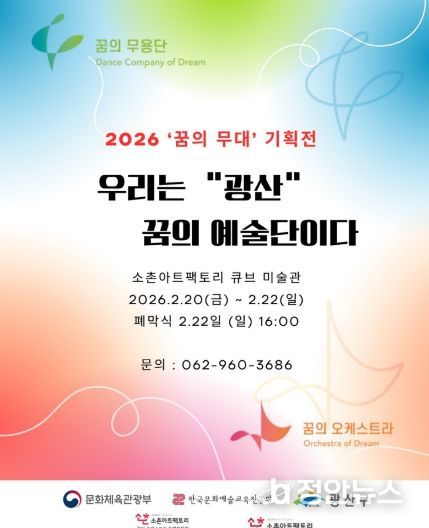 정안뉴스 안정주 기자 | 광주 광산구는 20일부터 22일까지 소촌아트팩토리 큐브미술관에서 2026 ‘꿈의 무대’ 아카이빙전 ‘우리는 ‘광산’ 꿈의 예술단이다‘를 연다고 밝혔다.