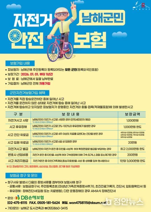 정안뉴스 김재홍 기자 | 남해군은 2026년에도 ‘남해군민 자전거안전보험’ 제도를 운영한다.