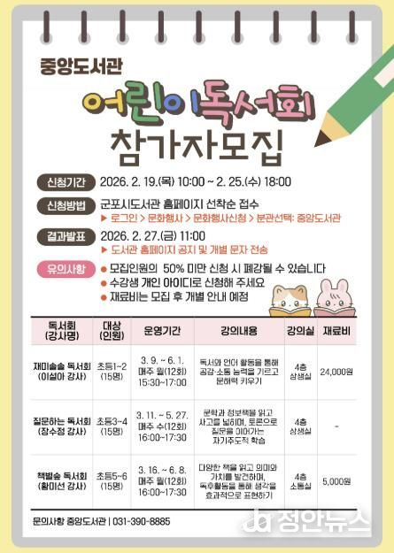정안뉴스 안정주 기자 | 군포시 중앙도서관은 독서를 통해 생각하고 함께 소통하며 올바른 독서습관 형성과 문해력을 키우는 아동 및 청소년 대상 독서회를 오는 3월 9일부터 6월 13일까지 운영한다.