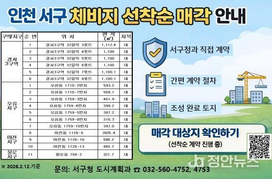 정안뉴스 안정주 기자 | 인천 서구는 도시개발구역·구획정리사업지구 내 체비지 잔여 물량 17필지를 선착순 수의계약 방식으로 매각한다고 밝혔다.