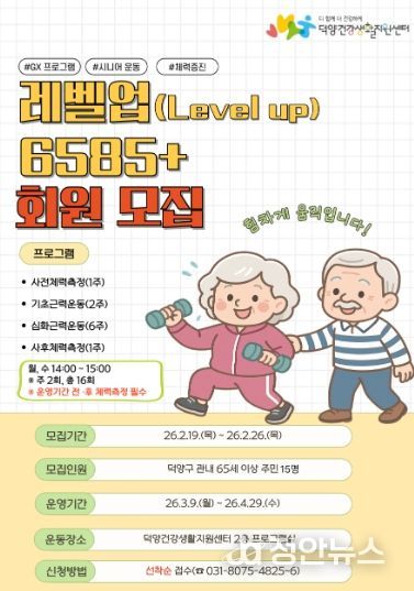 정안뉴스 안정주 기자 | 고양특례시 덕양구보건소 덕양건강생활지원센터가 관내 어르신의 체력 등급 향상을 위한‘레벨업(Level Up) 6585+’참여자를 모집한다.