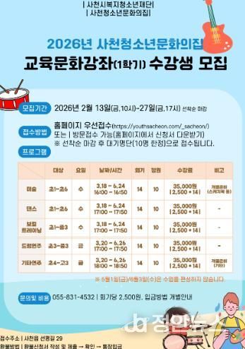 정안뉴스 김재홍 기자 | 사천시 복지·청소년재단 청소년문화의집은 청소년들의 재능 발굴과 건강한 자아 성장을 지원하기 위해 ‘2026년 1학기 교육문화강좌’ 수강생을 모집한다.