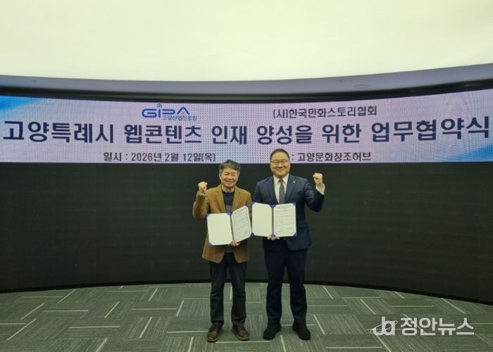 정안뉴스 안정주 기자 | 고양산업진흥원이 지난 12일 고양문화창조허브에서 한국만화스토리협회와 웹툰·웹소설 분야 전문 인재 양성을 위한 업무협약을 체결했다.