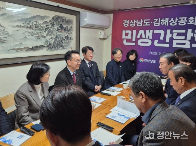 정안뉴스 김재홍 기자 | 경상남도는 13일 김해상공회의소에서 지역 상공인 대표들과 간담회를 개최해 기업 현장의 애로사항을 청취하고 지역경제 활성화를 위한 주요 현안을 논의했다고 밝혔다.