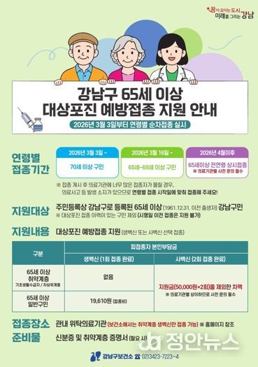 정안뉴스 안정주 기자 | 꿈이 모이는 도시, 미래를 그리는 강남구가 65세 이상 강남구민을 대상으로 대상포진 예방접종 지원을 확대한다. 기존 기초생활수급자 중심의 지원을 65세 이상 전체 구민으로 넓히고, 3월 3일부터 연령별 순차 접종을 시행한다.
