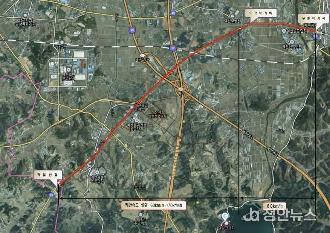 벚꽃로 구간은 기존 시속 50㎞에서 60㎞로, 국도21호선 구간은 시속 60㎞에서 70㎞로 각각 상향 조정된다.