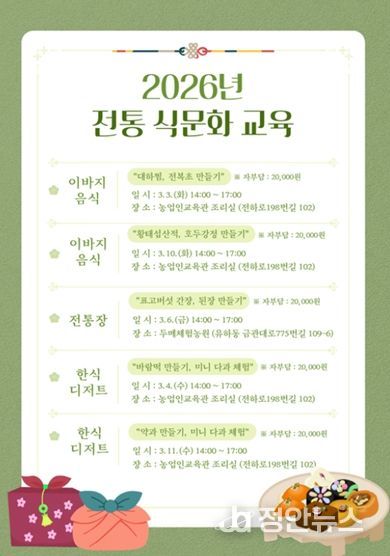 정안뉴스 김재홍 기자 | 김해시는 3월 3일부터 3월 11일까지 ‘2026년 전통 식문화 교육’을 운영한다고 밝혔다.