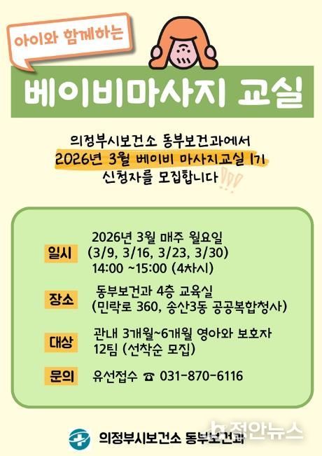 정안뉴스 안정주 기자 | 의정부시 보건소는 2월 24일부터 ‘베이비 마사지교실’ 1기 프로그램에 참여할 3~6개월 영아와 보호자 12팀을 모집한다.