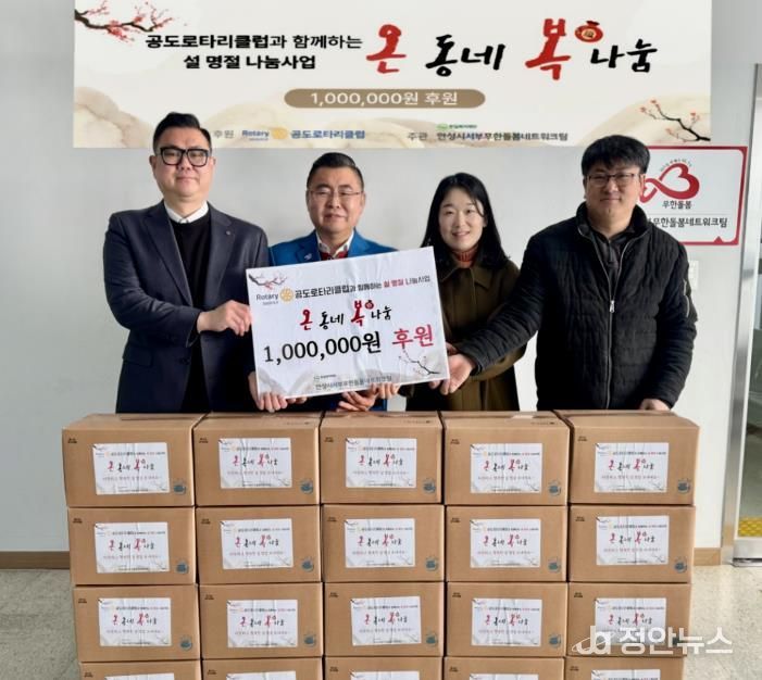 정안뉴스 안정주 기자 | 사회복지법인 한길복지재단이 수탁 운영하는 안성시서부무한돌봄네트워크팀은 국제로타리 3600지구 공도로타리클럽과 지난 12일 설 명절 나눔사업 ‘온동네 복나눔’ 후원금 100만 원 전달식을 가졌다.
