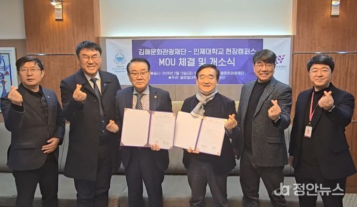 정안뉴스 김재홍 기자 | (재)김해문화관광재단과 인제대학교는 지난 13일, 지역 문화관광사업의 발전 및 ‘All City Campus’ 생태계 조성을 위한 업무협약을 체결하고, 대학과 지역 사회가 밀착된 ‘현장캠퍼스’ 운영에 본격 나선다고 밝혔다.