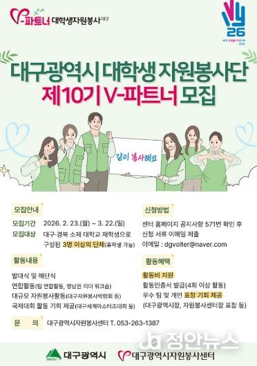 정안뉴스 안정주 기자 | 대구광역시는 대구광역시자원봉사센터와 함께 지역사회 혁신과 자원봉사 문화 확산을 이끌어갈 ‘제10기 V(Volunteer)-파트너 대학생 자원봉사단’ 참여자를 오는 3월 22일까지 모집한다.