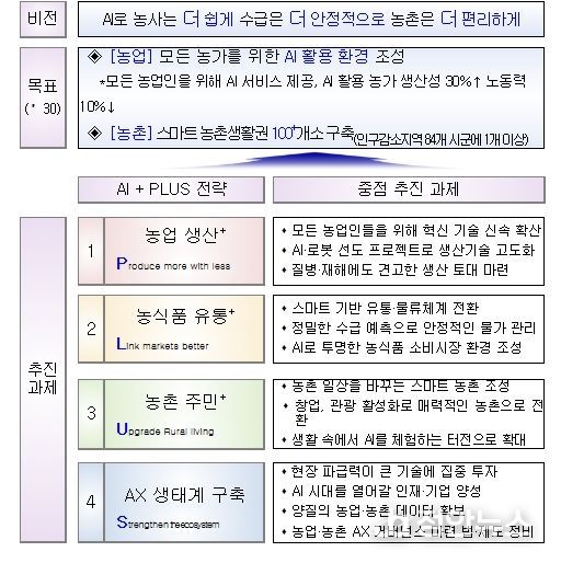 이번 전략은 ‘인공지능(AI)으로 농사는 더 쉽게, 수급은 더 안정적으로, 농촌은 더 편리하게’를 비전으로 설정하고, 이를 실현하기 위해 ① 농업 생산성 혁신, ② 농식품 유통구조 고도화, ③ 농촌 주민 삶의 질 개선, ④ 인공지능 전환(AX) 생태계 기반 조성 등 4대 분야를 설정하고 13대 과제를 중점적으로 추진할 계획이다.
