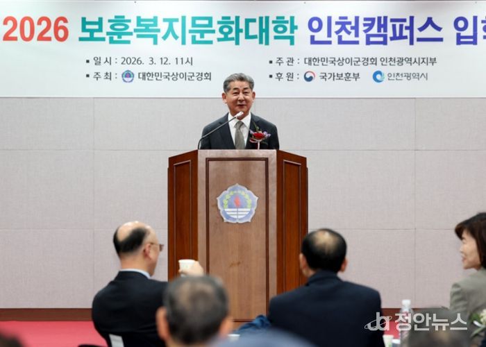 정안뉴스 안정주 기자 | 인천광역시의회 정해권 의장(국・연수구1)은 12일 인천상이군경회가 주관한 ‘2026년도 보훈복지문화대학 인천캠퍼스 입학식’에 참석해 국가유공자와 보훈 가족을 격려했다.