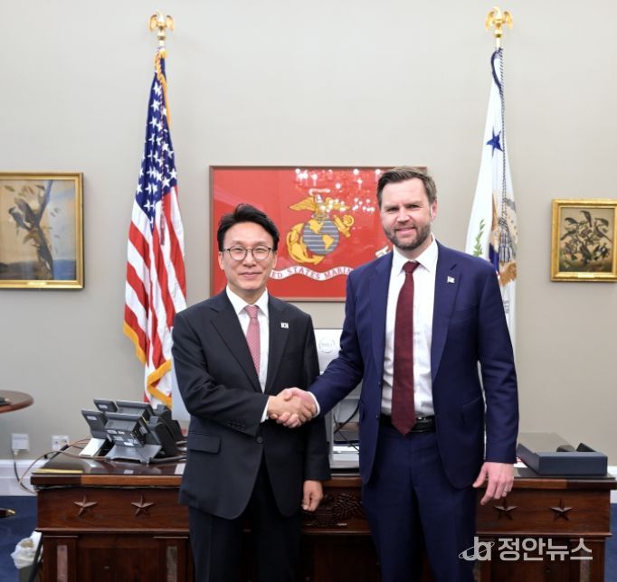 정안뉴스 안정주 기자 | 김민석 국무총리는 미국 방문 첫째 날인 3월 12일 오후, 워싱턴 D.C. 백악관에서 'J.D. 밴스(James David Vance)'미국 부통령과 회담을 가졌다. 지난 1월 밴스 부통령과의 첫 회담 이후 약 50일 만에 개최된 회담이다.