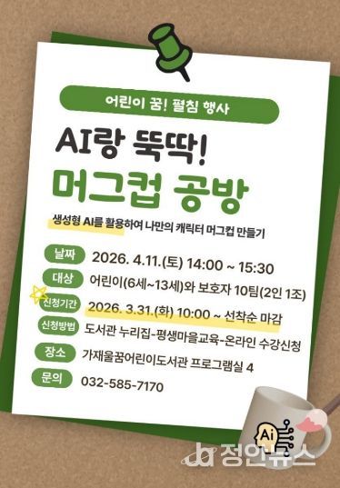 정안뉴스 안정주 기자 | 인천광역시교육청서구도서관은 오는 4월, 어린이를 동반한 가족이 참여하는 생성형 AI를 활용한 특별 프로그램 ‘AI랑 뚝딱! 머그컵 공방’을 운영한다.
