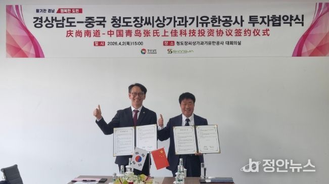 경남도는 2일 중국 산둥성 칭다오시에 위치한 청도장씨상가과기유한공사(이하 장씨상가) 본사에서 경남 도내 자동차 부품 제조시설 투자를 위한 양해각서(MOU)를 체결했다고 밝혔다.